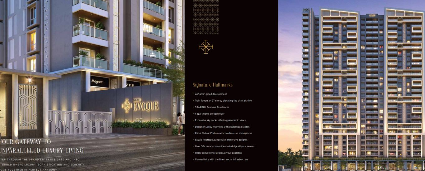 Experience the epitome of luxury, elegance and comfort at *Nyati Evoque,* set in the vibrant heart of *Kalyani Nagar.* Crafted to the highest standards, these exquisite 3 and 4-bedroom residences combine spacious layouts, premium finishes, and exclusive amenities for an elevated lifestyle.