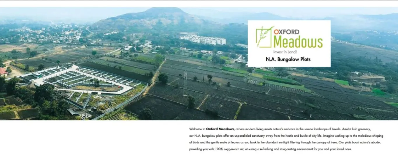 Welcome to Oxford Meadows, where modem living meets nature's embrace in the serene landscape of Lavale. Amidst lush greenery, our N.A. bungalow plots offer an unparalleled sanctuary away from the hustle and bundle of city life, Imagine waking up to the melodious chirping of birds and te gente rusle of leaves as you bask is the abundant sunlight litering through the canopy of trees. Our plots boast nature's abode, providing you with 100% oxygeneich als ensuring a refreshing and invigorating environment for you and your loved ones.