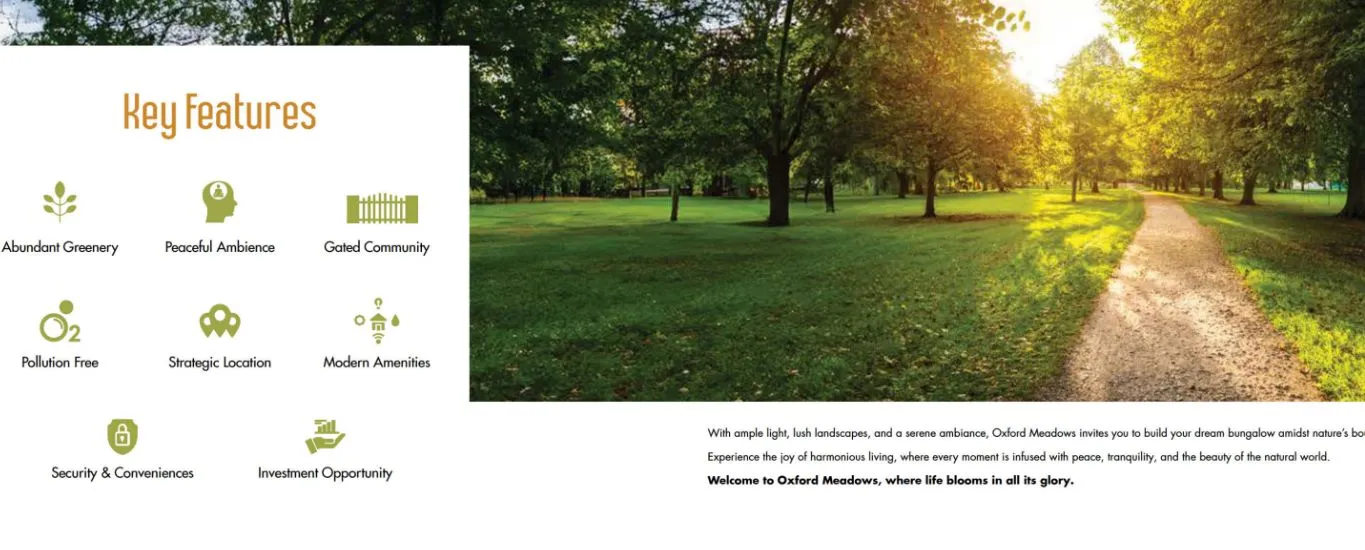 With ample light, lush landscapes, and a serene ambiance, Oxford Meadows invites you to build your dream bungalow amidar nature's bounty Experience the joy of harmonious living, where every moment is infused with peace, tranquility, and the beauty of the natural world.